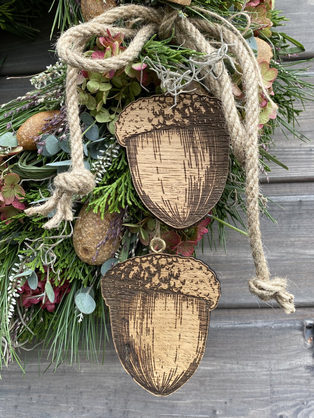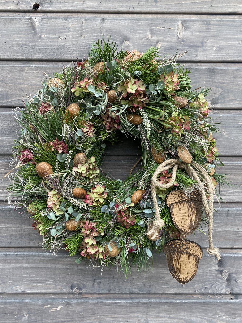 Tento ručně vyráběný věnec je jedinečným kouskem, který vnese do vašeho domova kouzlo podzimu a přírody. Bohatá kombinace přírodních větviček, hortenzií, eukalyptu, vřesu a vzdušné tillandsie působí elegantně a svěže. Dekorativní plody a závěs se dvěma dřevěnými žaludy na jutovém provázku dotvářejí hřejivý přírodní vzhled.