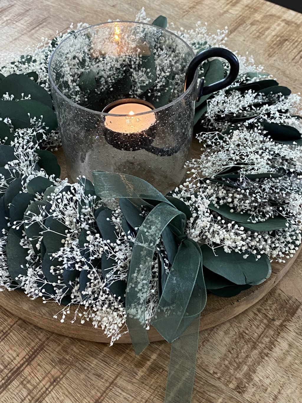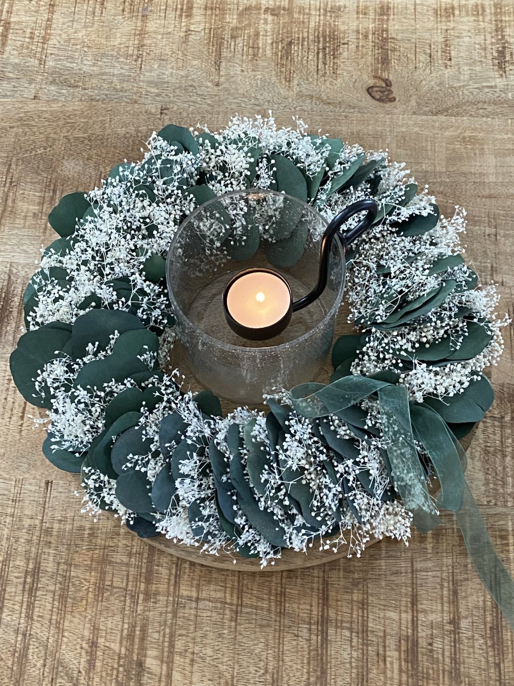 Celoroční dekorativní věnec ze stabilizovaného Eukalyptu a stabilizované Gypsophily o průměru 30 cm. Univerzální interiérová dekorace na zavěšení či položení, ideální jako základ pro sezónní aranžmá. Vynikne s vloženým svícnem. Díky stabilizovaným rostlinám vydrží více sezón.