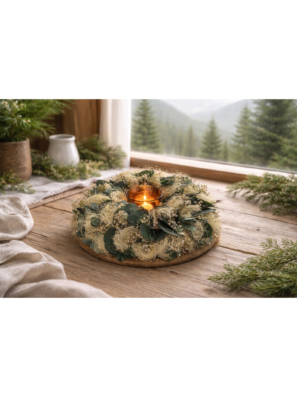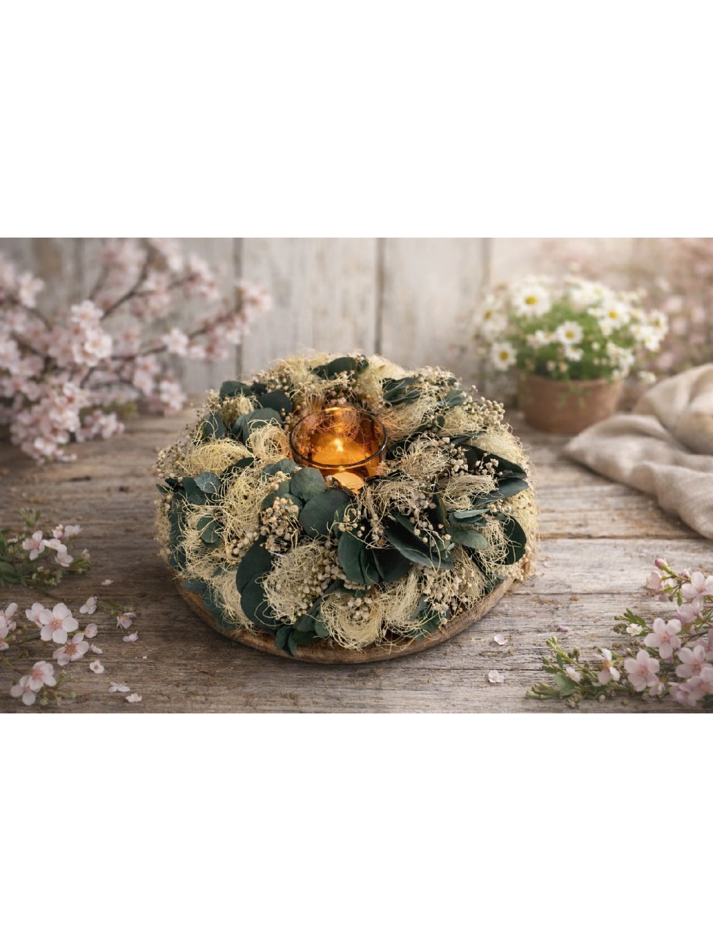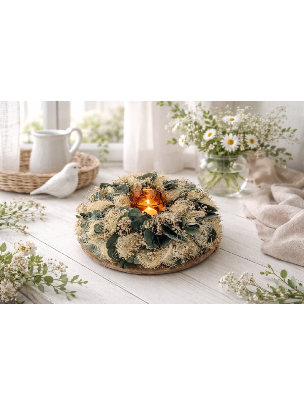 Jemný, nadčasový věnec NĚHA působí, jako by byl utkán z kokosového vlákna. Kombinace stabilizovaného eukalyptu a stabilizované gypsophily vytváří lehký, přírodní a velmi harmonický vzhled.