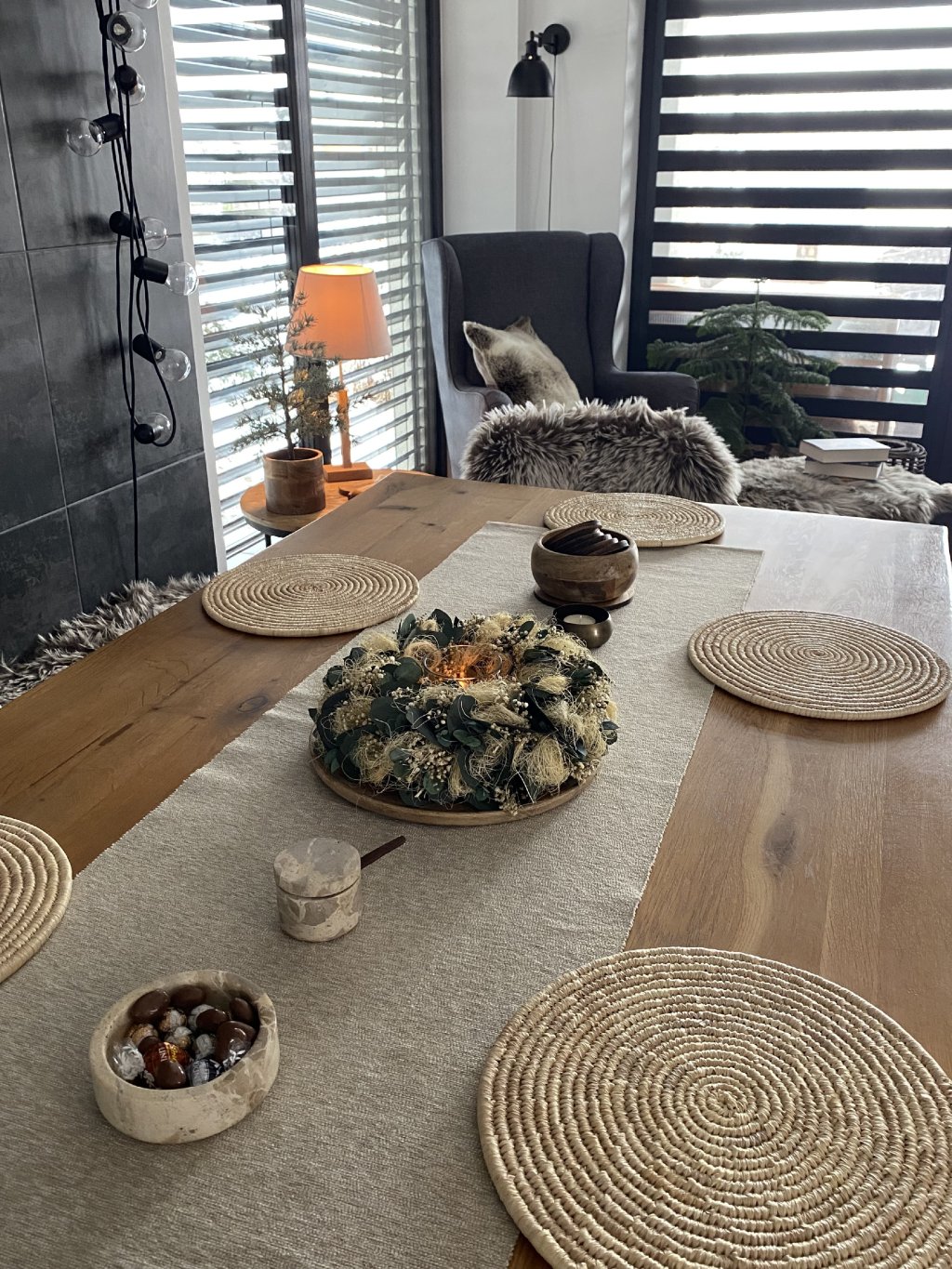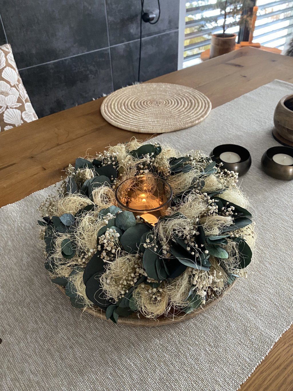 Věnec má průměr 30 cm a je určen do interiéru – krásně vynikne na stole, komodě i jako dekorace na poličce. Díky použití stabilizovaných rostlin vám bude dělat radost po celý rok, bez nutnosti údržby. Poslední 3 fotky, jsou upraveny pomocí AI, abyste viděli, jak bude vypadat v různých interiérech.