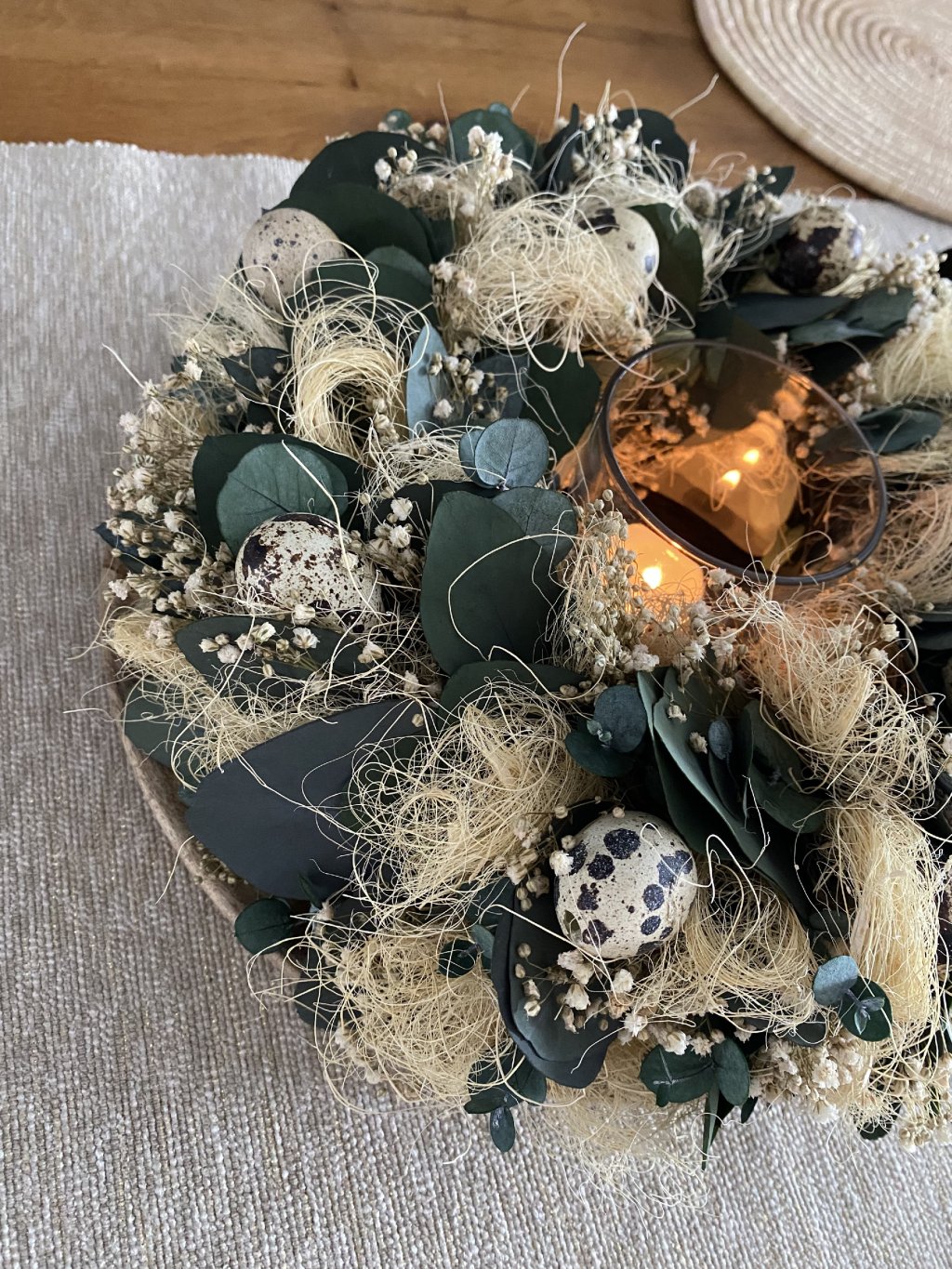 Na Velikonoce stačí do věnce volně vložit křepelčí vajíčka – po svátcích je jednoduše vyndáte a věnec je opět neutrální. Na podzim ho můžete doladit malými šiškami nebo žaludy a vytvořit tak sezónní atmosféru během chvilky.