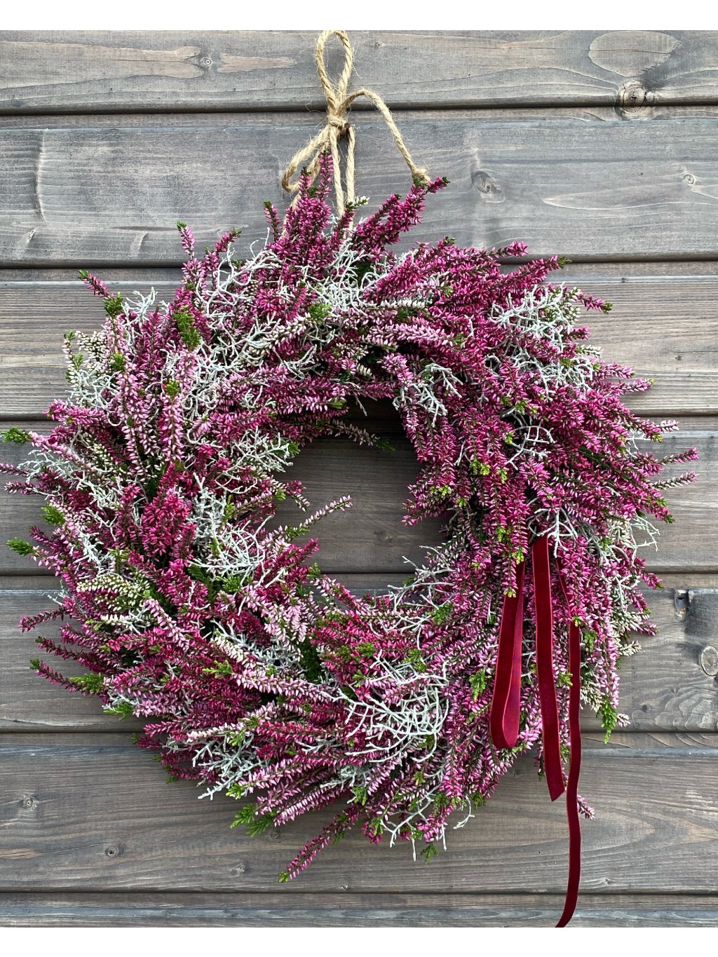 Okouzlující ručně vázaný věnec z jemného vřesu a dekorativního drátovce přináší do vašeho domova nádech přirozené elegance.