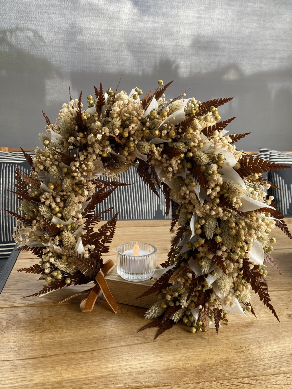 A je tady jedinečný věnec na dřevěném podstavci – originální spojení stabilizovaných a sušených květin, které okouzlí na první pohled. Nepřehlédnutelný kousek, který dodá vašemu domovu styl, osobitost a nádech přírodní elegance.